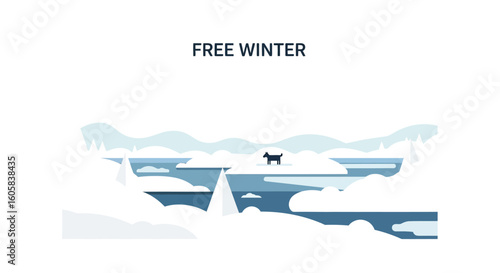 Minimalist winter illustration with small dog on ice floe under frosty sky scenery view