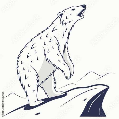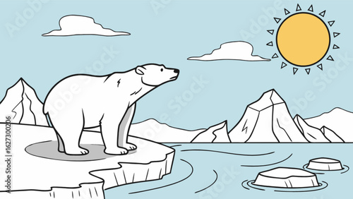 Illustration of a polar bear standing on an ice floe with mountains in the background, a symbol of arctic wildlife