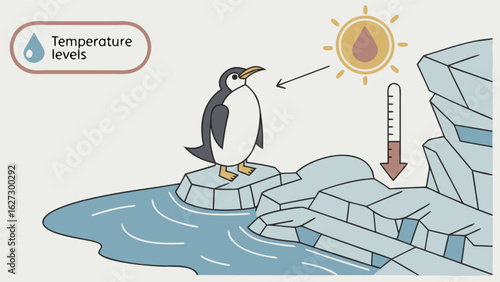 Penguin climate change temperature levels on ice floe global warming arctic environment illustration