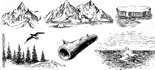 Vintage polar shoreline scene sketch - ice floe, mountains, and wildlife
