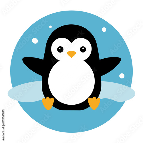 A cute cartoon penguin with orange feet and beak sits on an icy floe surrounded by a light blue circle with snowflakes