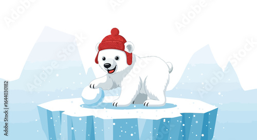 Cartoon polar bear playing with a snowball on ice floe in winter scene illustration
