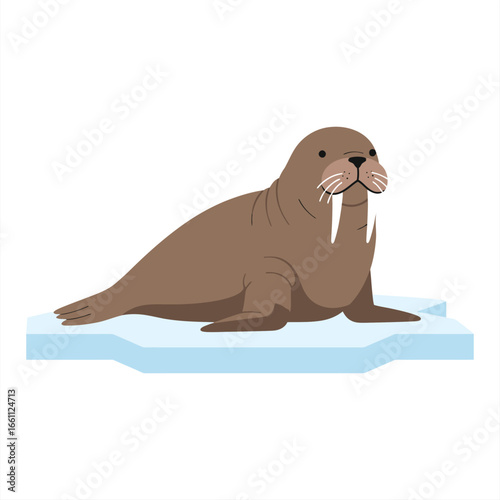 A digitally rendered illustration showcases a walrus, prominently featured, resting on a small ice floe.  The walrus is depicted in a three-quarter view, its textured