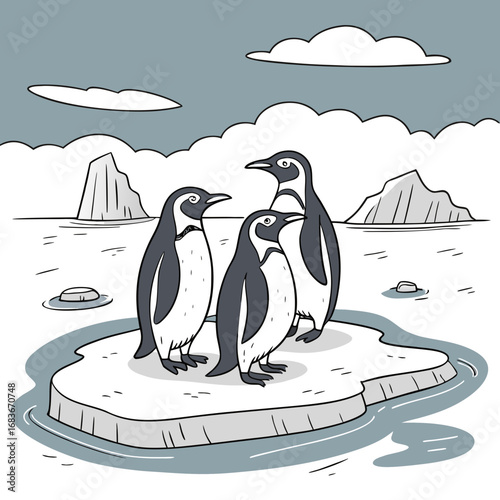 Three cute cartoon penguins standing together on an ice floe in the ocean under a cloudy sky