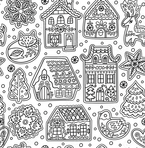 line drawn gingerbread houses, cookies, Christmas sweets and treats, gingerbread house shaped gingerbread cookies with decorations, fairy tale houses coloring book. Vector illustration