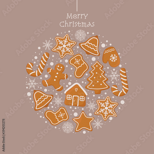 Christmas gingerbread cookies in cartoon style isolated on white background. Sweet sugar biscuits in circle composition. Festive shaped crackers. Vector illustration