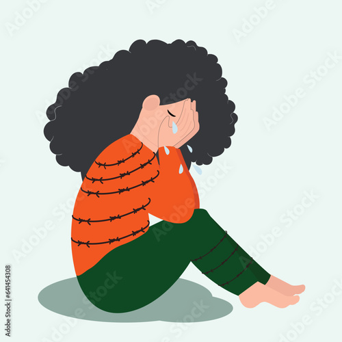 Sad woman sitting and hugging her knees with a heavy iron ball and chain attached to her ankle representing burden or addiction.