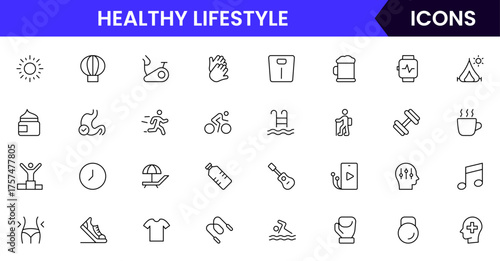 Lifestyle line icons set. Healthy lifestyle symbols. Happiness, diet, exercise, game, fitness, music, sleep, relationships and more, Editable Thin icon vector collections.