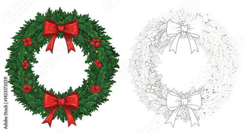 Festive Wreath and Outline: A vibrant, handcrafted holiday wreath, adorned with lush green foliage and a striking red bow, evokes the spirit of the festive season.