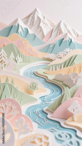 Intricate paper art landscape of mountains and rivers, layered paper cut style, soft pastel colors, delicate shadows, handcrafted look, high detail