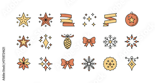 Festive holiday icons collection with stars, snowflakes, and ribbons in flat style