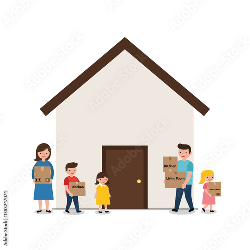 Happy Family Relocation Concept. Mother, Father and Little Kids Moving into New House. Characters Carry Cardboard Boxes
