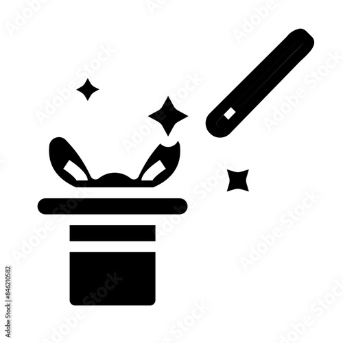 A classic magic trick icon with a rabbit appearing from a top hat. A simple black silhouette symbolizing magic, illusion, surprise, and entertainment.
