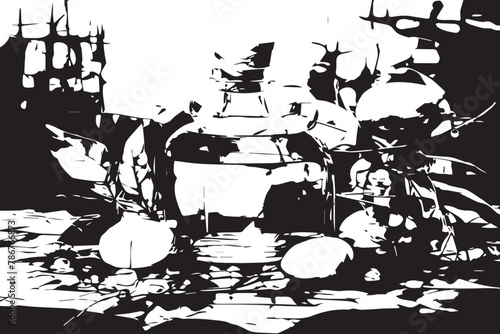 Symmetrical design with two praying kneeling medieval knights. Man wearing armor. Black and white negative silhouette.