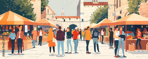 Medieval marketplace with vendors and stalls Vector flat minimalistic isolated illustration