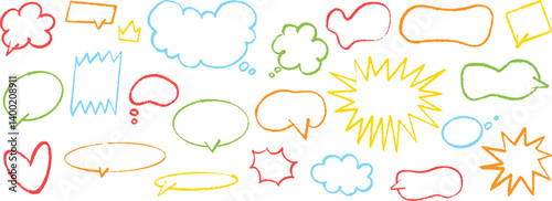 Set of colourful speech bubble in doodle style. Drawing talk clouds, text box with different shapes. Messages, thoughts. Communication, conversation, chat. Flat isolated vector illustrations on white