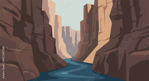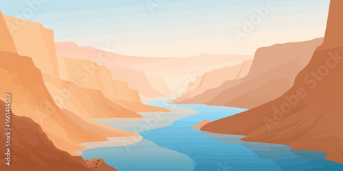 Stylized illustration of a majestic canyon with a winding river carving through layered rock formations under a clear sky