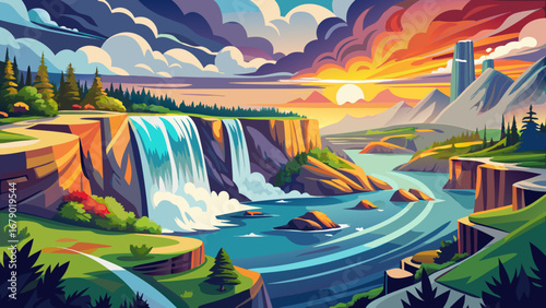 A scenic vista of a waterfall cascading into a serene river landscape illustration