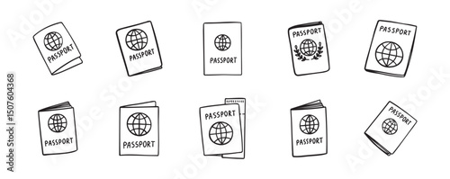 Vector linear illustration of passport and tickets isolated on paper background with abstract texture. Hand drawn sketch in retro style of passports.