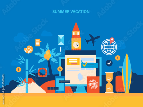 Flight booking. Online budget travel booking in internet plane flights reservation vacation holiday vector travelling service concept. Illustration of booking flight for travel by plane