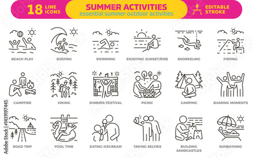 Summer activities icon set. Thin line editable stroke icons for holidays, beach vacations, outdoor adventures, camping, surfing, swimming, hiking, travel, festivals, relaxation, road trip and fun.