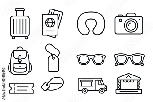 Travel outline icon set. Includes airplane, passport, luggage, car, hotel, map, beach, and vacation elements.