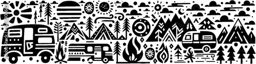 Hand‑Drawn Campervan and Bonfire Illustration, Tribal Outdoor Folk Art Pattern Vector for Camping and Adventure Travel Themes Design