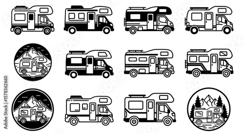 Various camper van icons are displayed. Graphic representations of recreational vehicles, vector illustration, travel and camping.