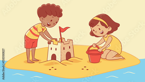 Adobe illustrator artwork vector illustration. A family with a camper van, a girl holding a map, and a dad taking photos, are on an adventurous trip near a volcano. Travel, vector