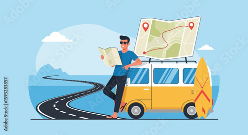 Young Man Planning a Road Trip Near the Coast with a Surfboard on Top