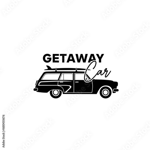 Getaway Car logo with a vintage station wagon and surfboards. Retro surf car silhouette for a summer road trip adventure. Classic automobile vector illustration.