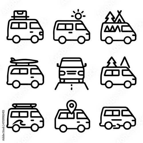Outlined Camper Vans Depicting Travel Adventure and Outdoor Activities.