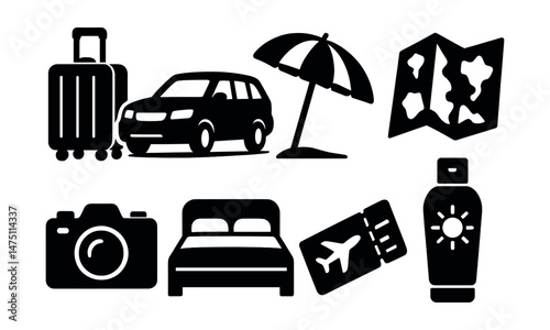Family vacation silhouette icons set – simple travel, holiday, and leisure symbols