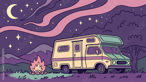 Illustration of a camper van parked near a campfire under a starry night sky with mountains and trees