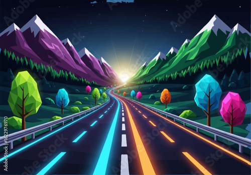 Neon Road Through Vibrant Mountain Forest at Sunset