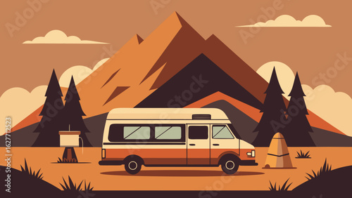 Retro camper van parked in a scenic mountain landscape with pine trees and warm sunset tones in flat illustration style