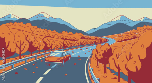 Stylized illustration of a car driving on a winding road through a vibrant orange autumn landscape with blue mountains.
