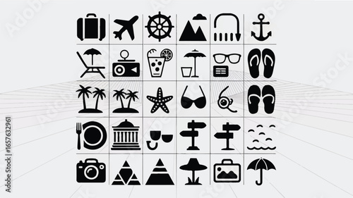 A set of 25 black and white travel and vacation icons arranged in a 5x5 grid on a white background.