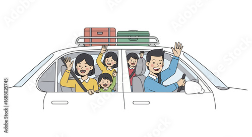 Cheerful Family Road Trip in a Car Waving Hands with Luggage.