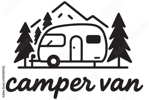 Minimalist Line Art Illustration of a Caravan, Mountains, Pine Trees, and "Camper Van" Text