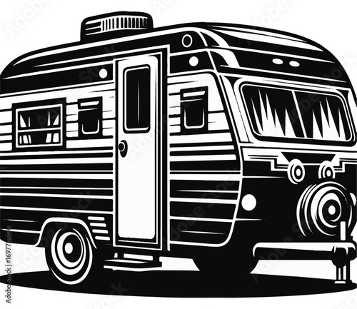 A detailed black and white illustration of a classic vintage camper trailer, depicted in a bold, graphic, and stylized manner.