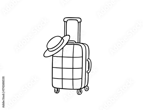 Minimal line art suitcase with travel hat. Abstract suitcase illustration in black and white, holiday suitcase design for vacation, trip and tourism vector outline for poster and decorative art