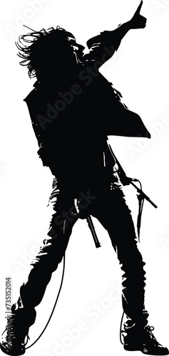 Pixel art illustration of a male rocker with spiked hair sunglasses leather jacket and ripped jeans singing into a vintage microphone