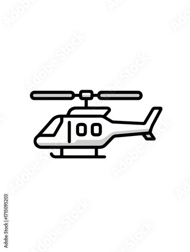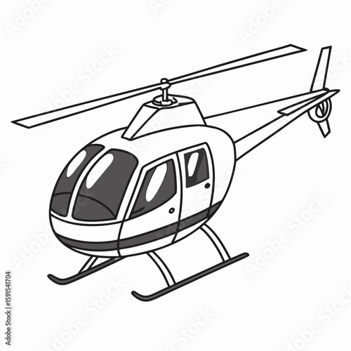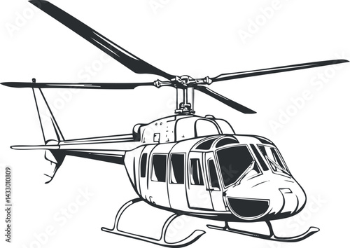 Black and white vector illustration of a helicopter with visible rotor blades and cockpit details