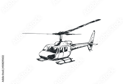 Vintage helicopter sketch art with detailed rotor blades. Vector retro hand drawn illustration
