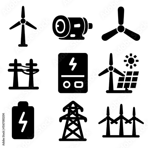 Wind Energy Icons. Solid, filled icon set of wind energy and technology: wind turbine, generator, rotor blades, power lines,