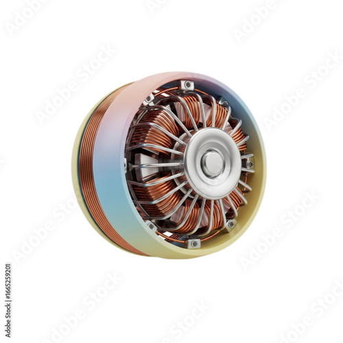 Close up of a detailed electric motor rotor with copper windings isolated on transparent background