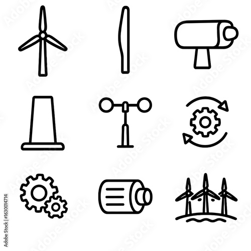Wind Power Icon Set. Outline icon set of wind power components: wind turbine, rotor blade, nacelle, tower base, anemometer, yaw