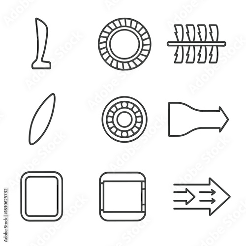 Axial Compressor Components. Line style icons of axial compressor modules: axial rotor blade, stator ring, multistage blade row,