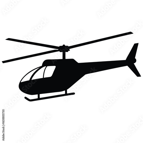 Helicopter. Main rotor with 4 blades, bubble cockpit, and skid landing gear. Simple silhouette